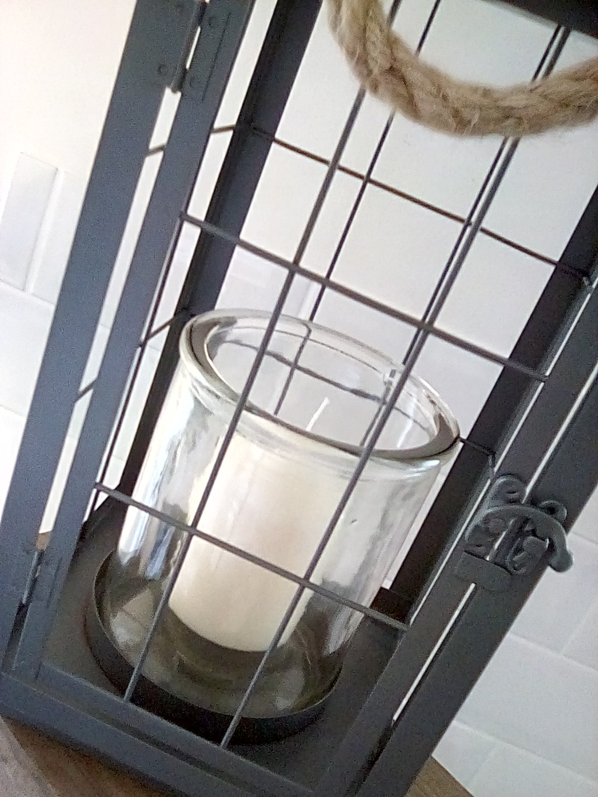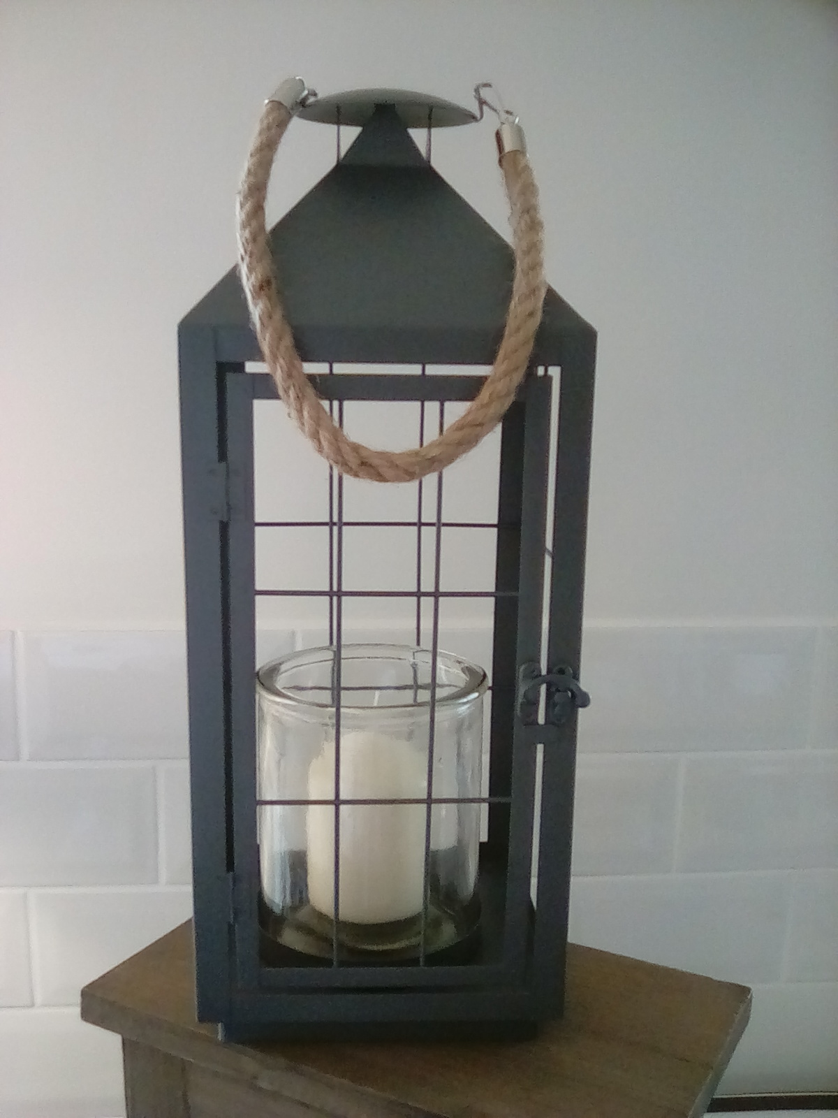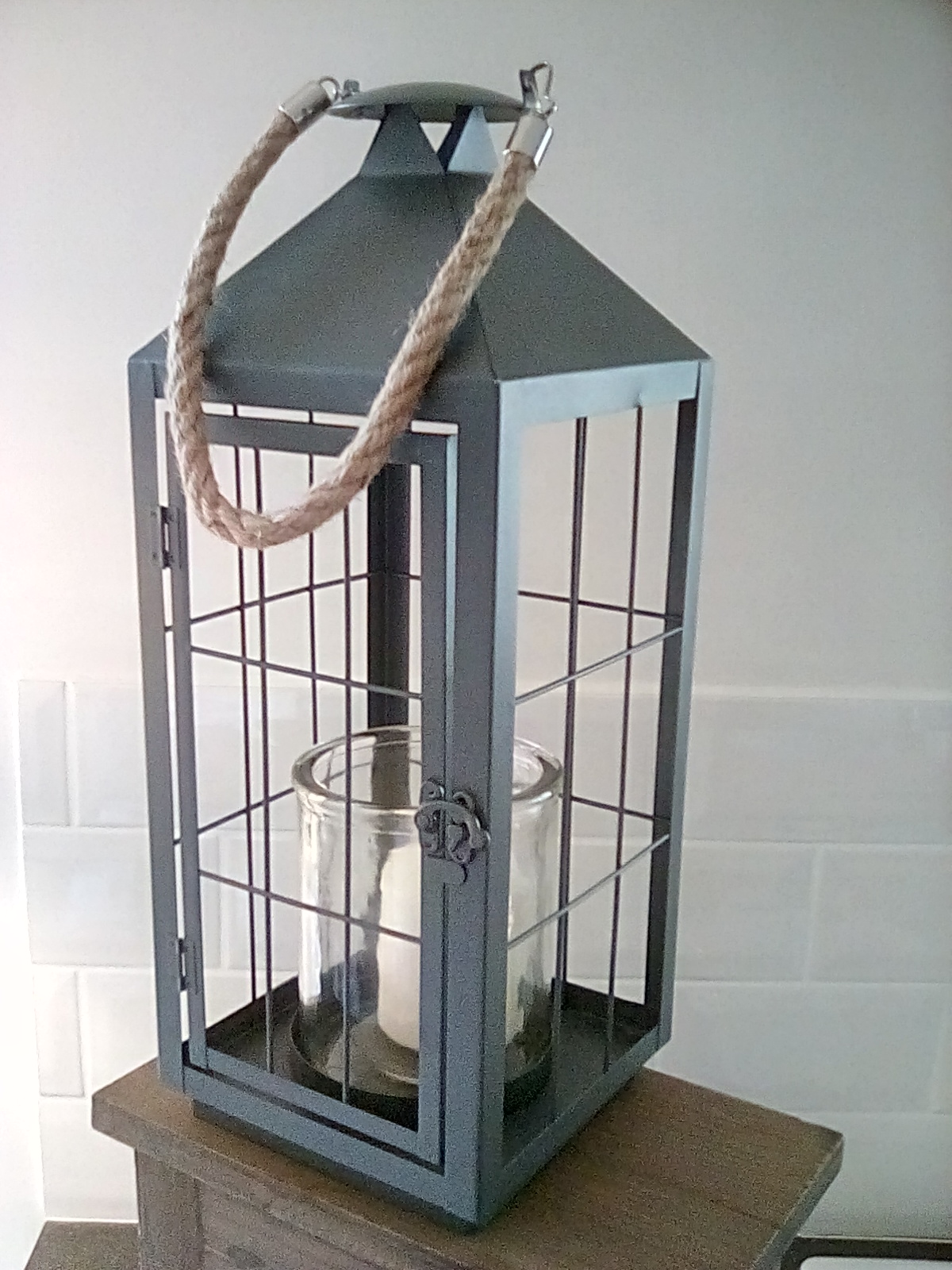 This chic grey metal lantern complete with glass container and wax candle (included) is perfectly proportioned to fit into the home. The candle can be replaced with microlights.